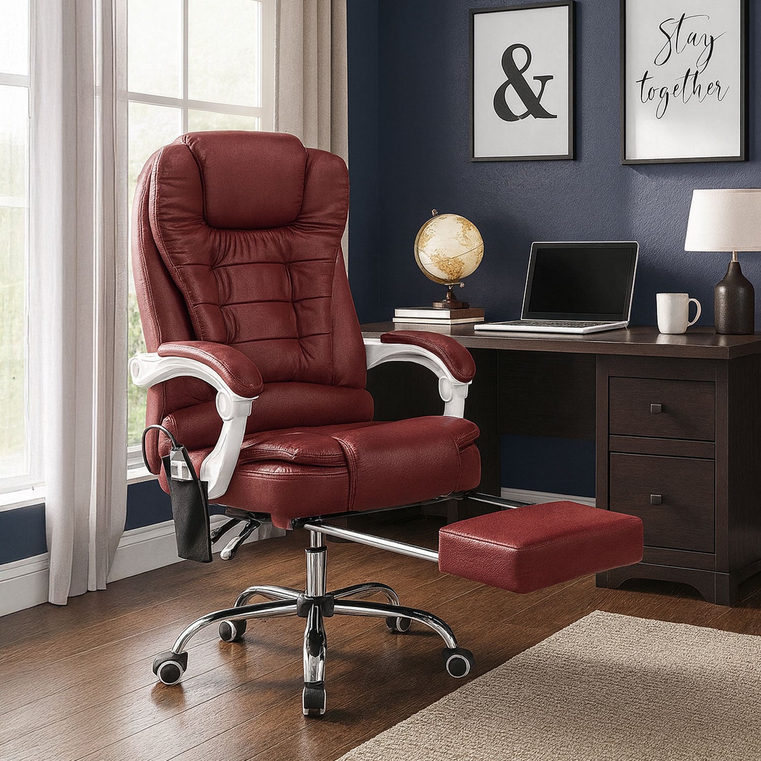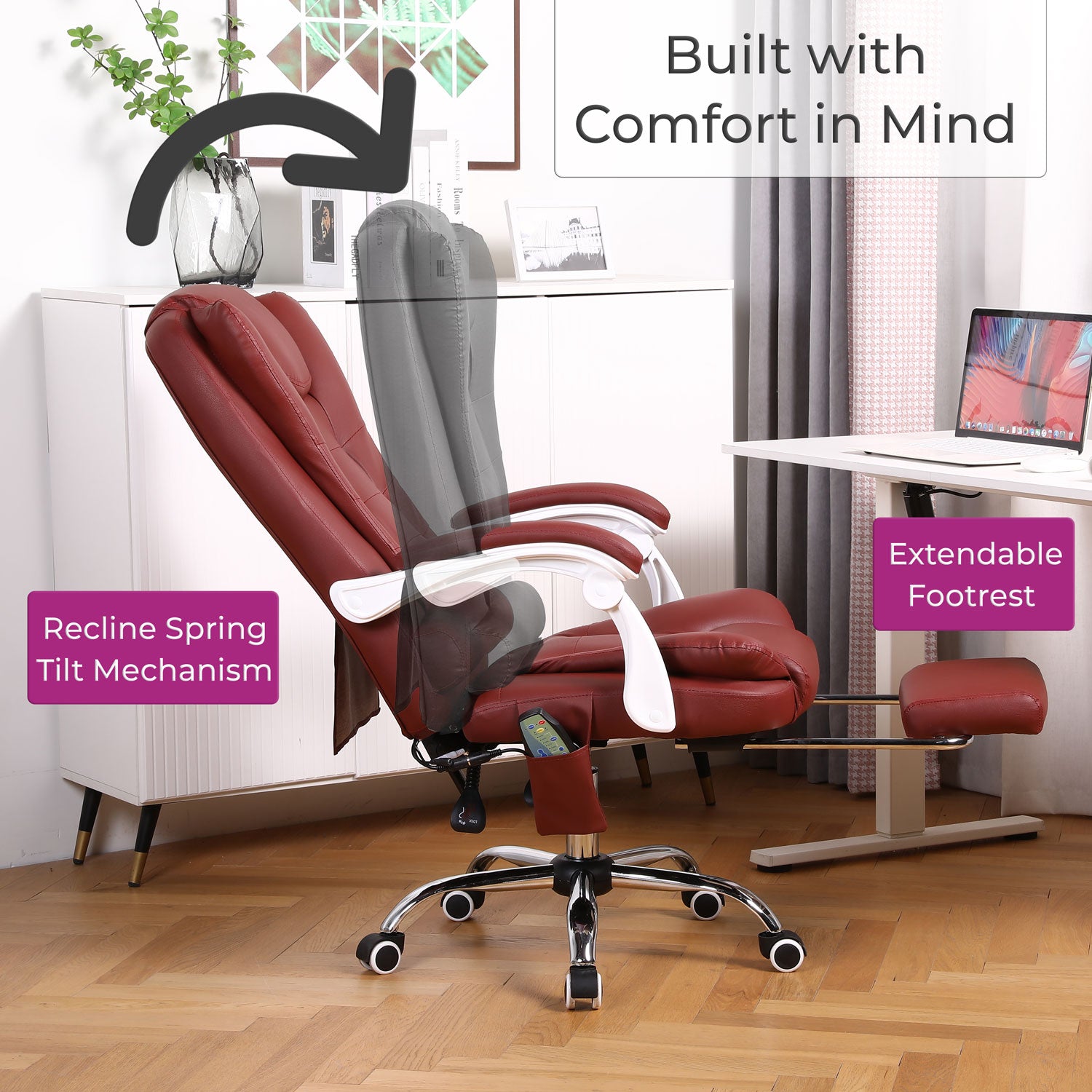Executive office chair in brown faux leather with massage function, footrest and steel frame. Double-padded for extra comfort with heavy-duty coating for durability. Pneumatic adjustable height and 360° swivel for accessibility. Reclining function with spring tilt control for easy adjustments. Built in comfortable footrest. Remote control included for Massage. Matching pouch for storage of remote. 5 Massage modes to chose from. Massages Back, Lumbar and Thighs. Flame Resistant Leather Chair. One year manufacturer warranty.
