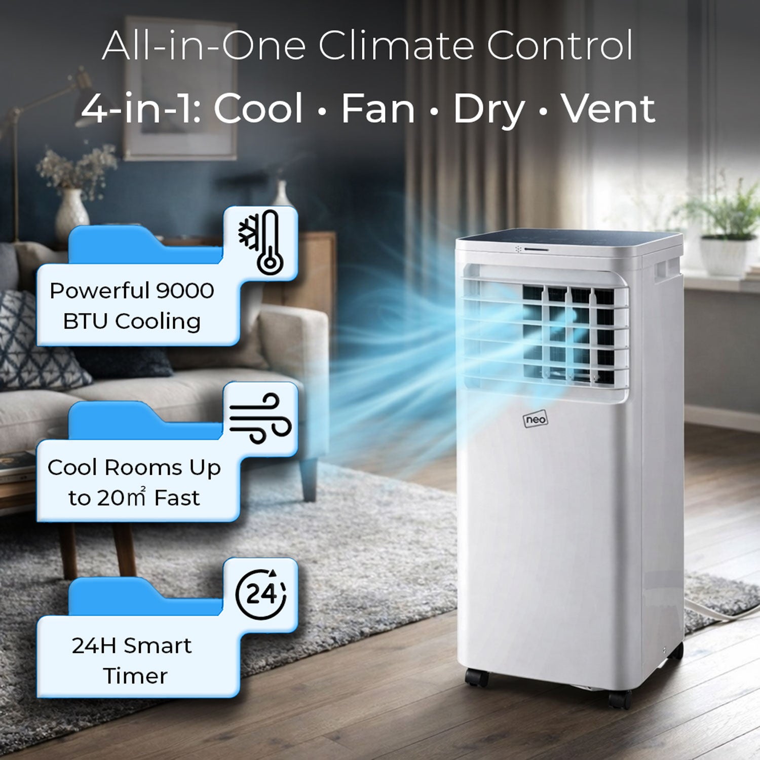 This versatile 3-in-1 air conditioner functions as a cooler, fan, and dehumidifier, giving you year-round flexibility. The digital thermostat allows precise temperature settings from 16°C to 32°C, while the 24-hour timer lets you schedule an operation to suit your daily routine.