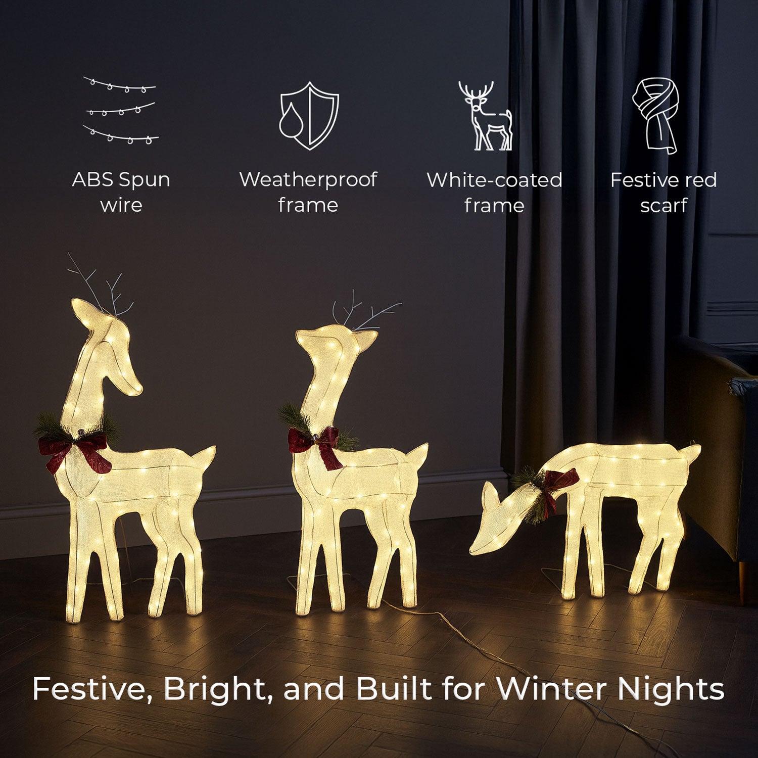Create a magical holiday atmosphere with this Set of 3 LED Lighted Reindeer Christmas Decorations. Featuring 210 dual LEDs with warm white, white, and mix effects, these elegant reindeers bring festive sparkle to any space. Each reindeer is beautifully designed with a white frame, white fabric covering, and festive red bows with greenery accents, making them a charming addition to your yard, garden, porch, or indoor holiday décor. The 24V low-voltage transformer ensures safe and efficient operation, while the 6-hour ON / 18-hour OFF timer adds convenience. Built to last with a weatherproof-coated frame and ground hooks for stability, this reindeer family set is the perfect centrepiece for your Christmas light display.