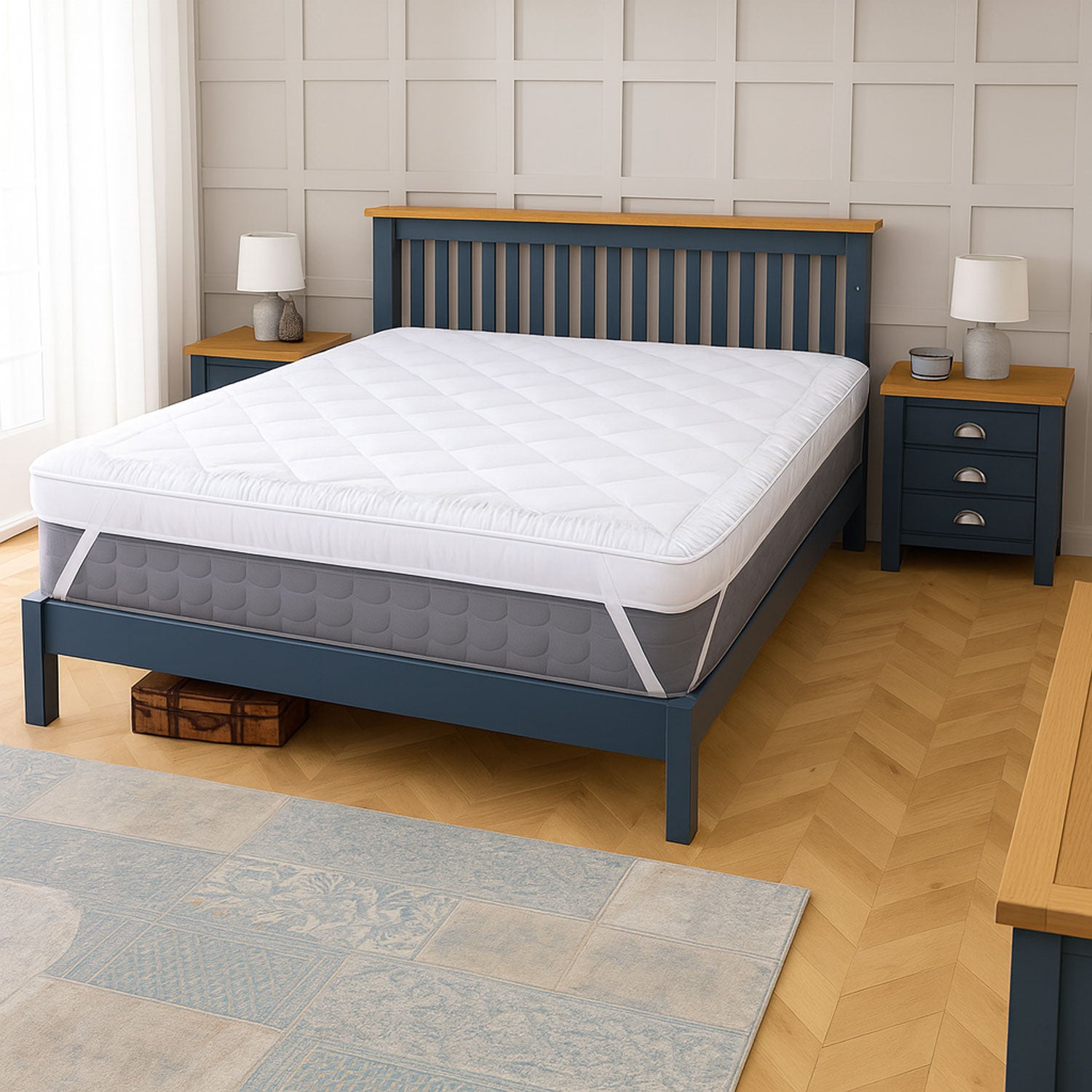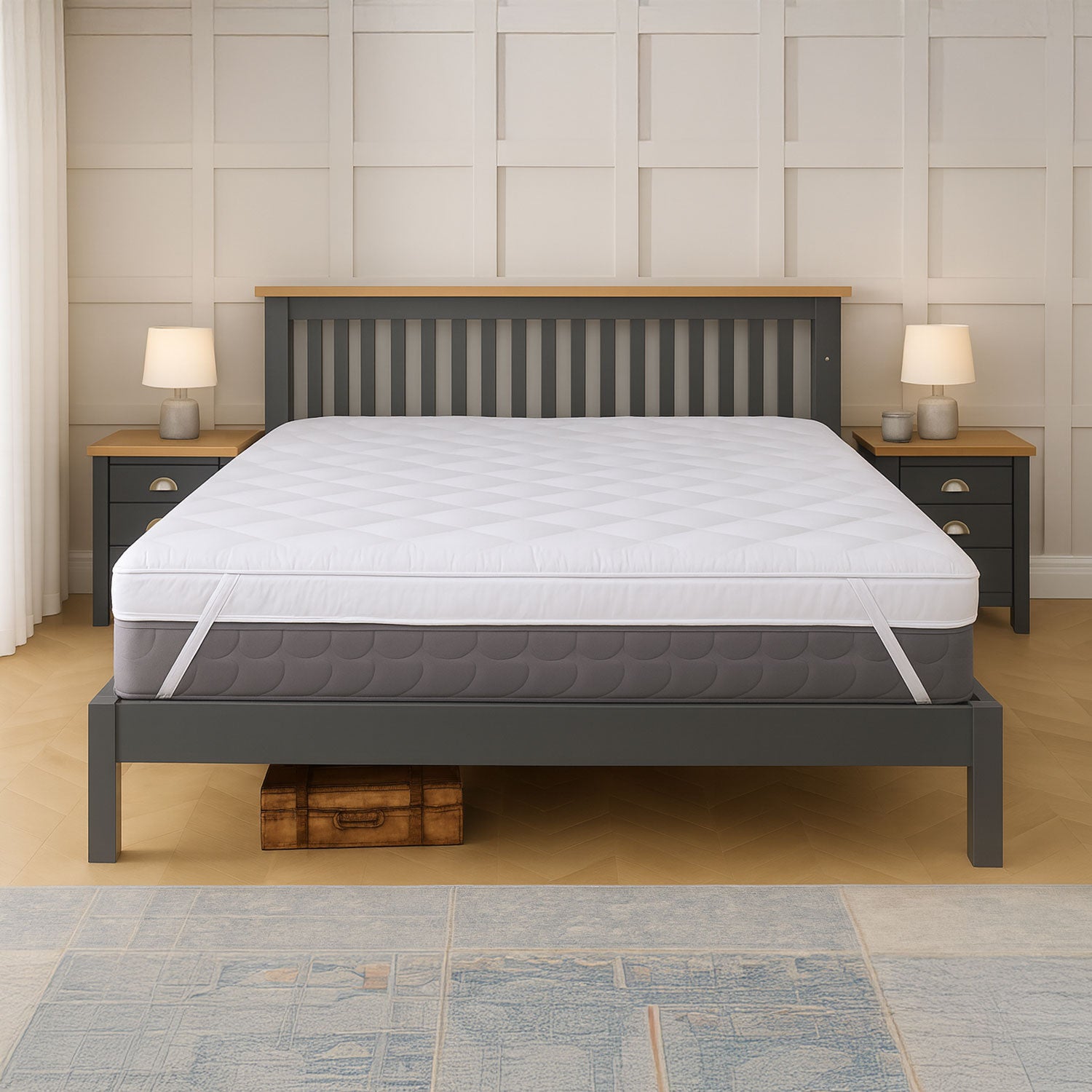 The diamond-pattern quilting not only enhances durability but also provides an even distribution of comfort across your bed surface. With four strong elasticated corners, it fits securely on your mattress to prevent shifting or bunching while you sleep.