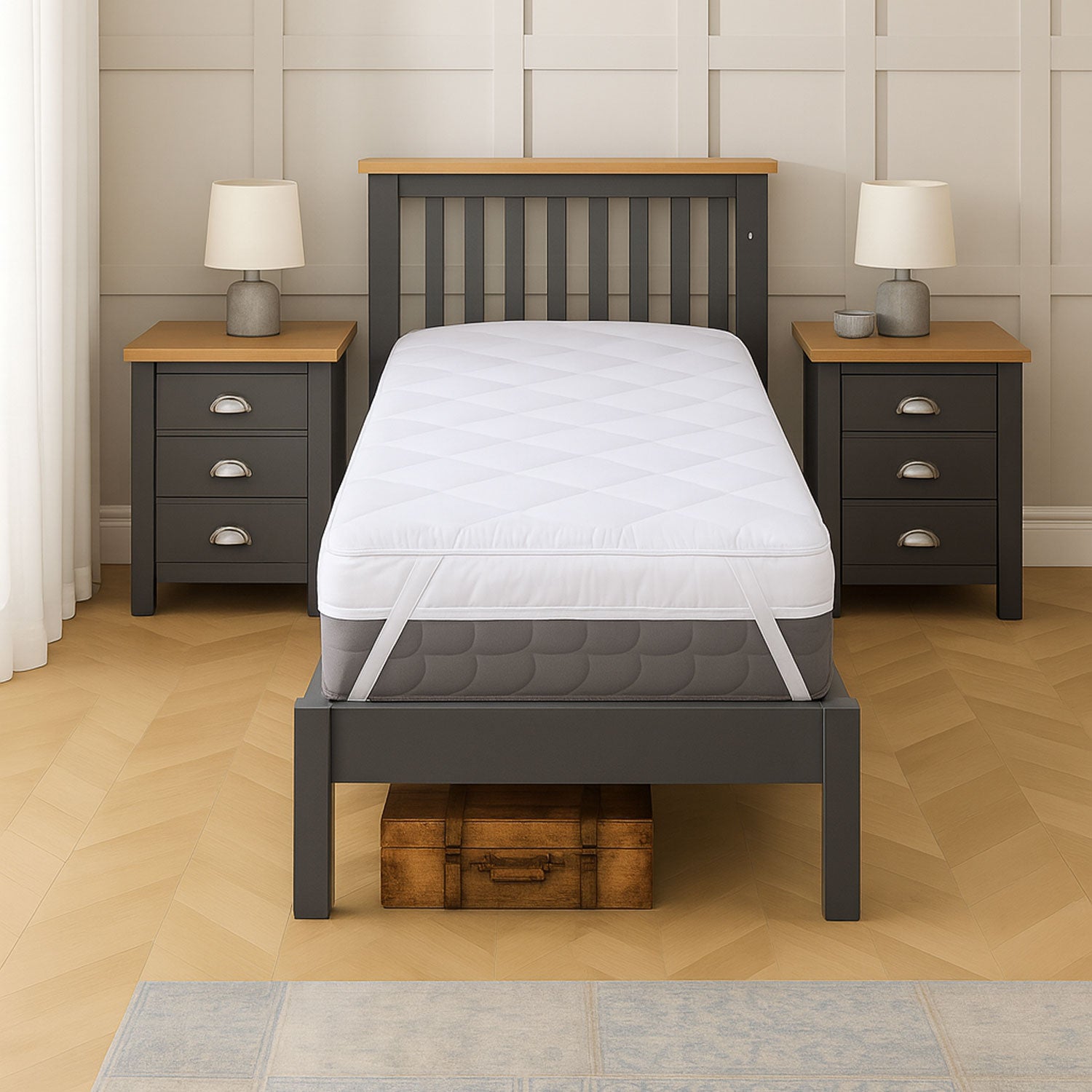The diamond-pattern quilting not only enhances durability but also provides an even distribution of comfort across your bed surface. With four strong elasticated corners, it fits securely on your mattress to prevent shifting or bunching while you sleep.