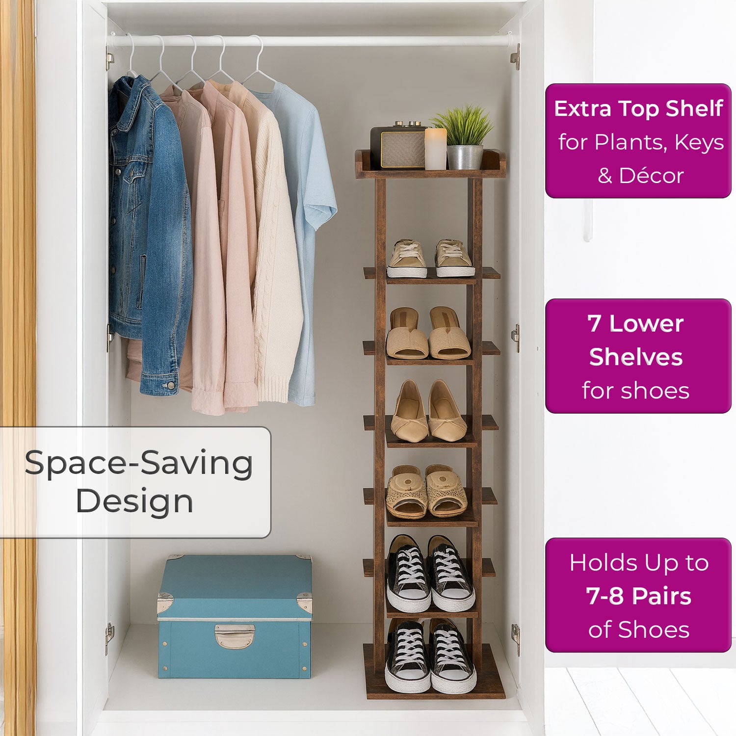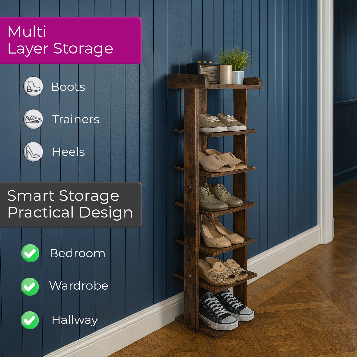 • Space-Saving Design – Vertical structure with multiple shelves keeps shoes neatly arranged while saving floor space.