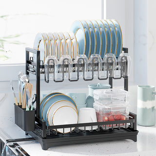 Neo Black 2 Tier Dish Drying Rack with Drip Tray and Drainage Spout