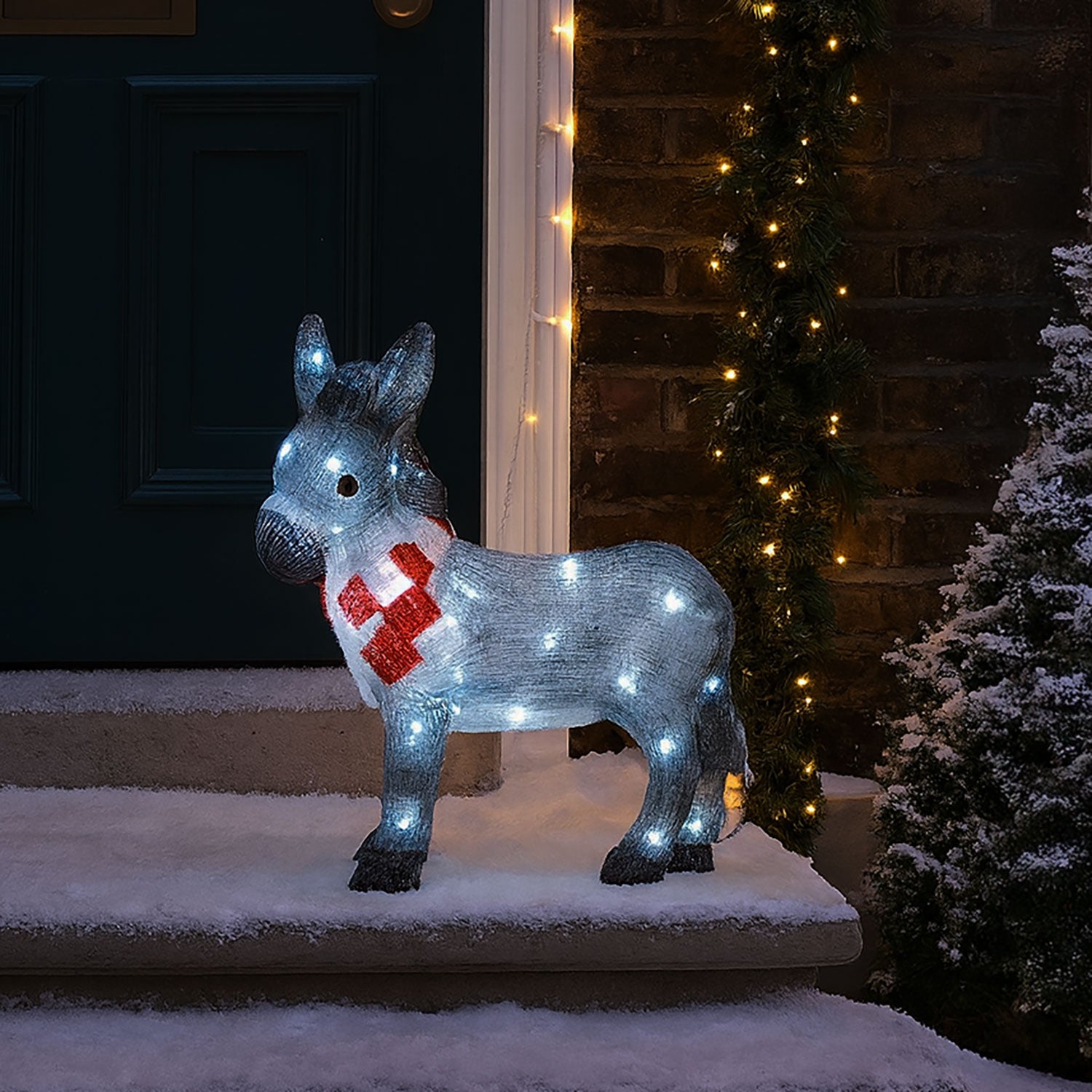 Enhance your holiday décor with the Neo Donkey Battery-Operated Outdoor Acrylic Christmas Light. Standing at 34 cm, this charming donkey decoration is illuminated by 30 cool white LEDs, creating a warm and inviting glow. Designed for both indoor and outdoor use, it's perfect for gardens, porches, or windowsills. The battery-powered feature eliminates the need for power outlets, offering flexible placement options. Additionally, the auto timer function ensures energy efficiency by automatically turning off after a set period. Bring festive cheer to your home with this delightful and convenient Christmas light decoration.